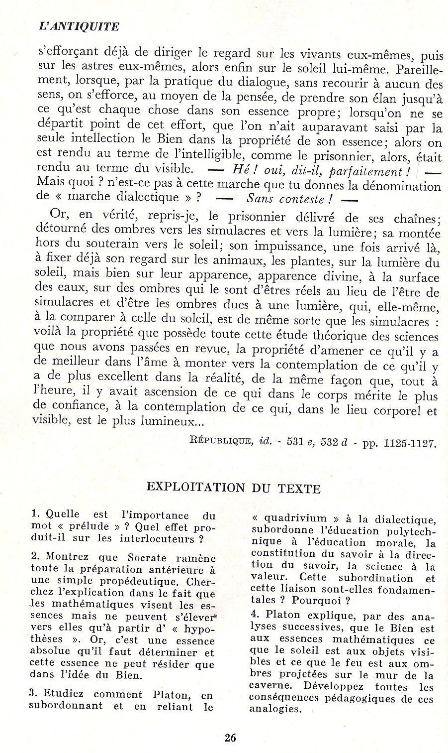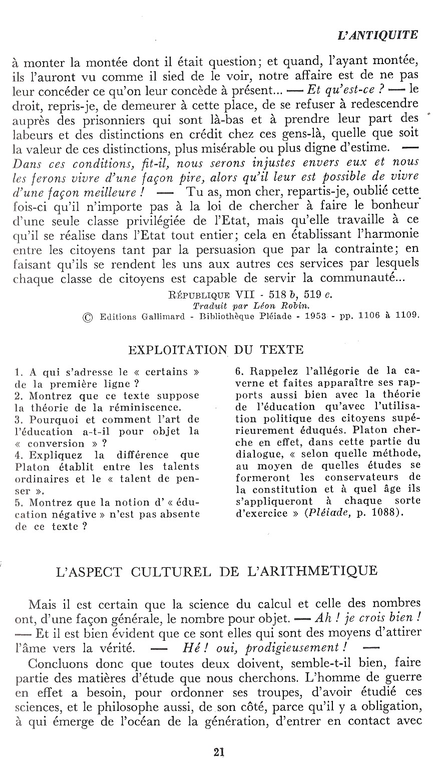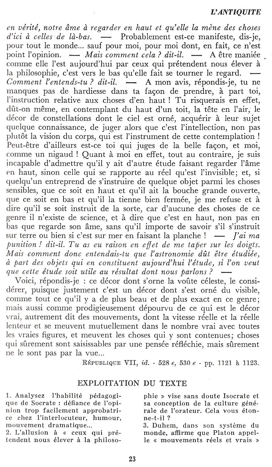 Platon : L'éducation des chefs - L'aspect culturel de l'arithmétique - L'aspect culturel de l'astronomie - L'harmonie - Dialectique et contemplation