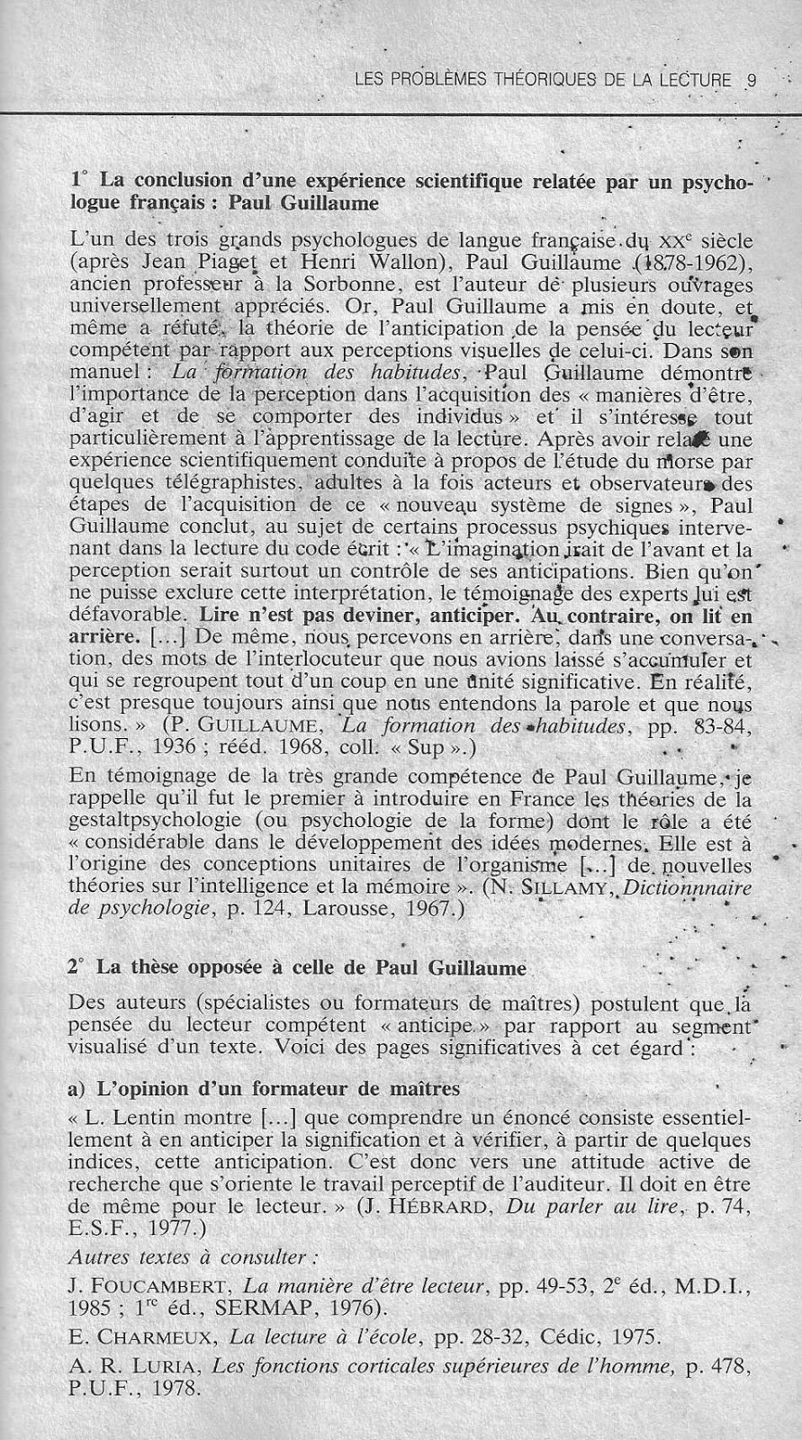 1° La conclusion d'une expérience scientifique relatée par un psychologue français : Paul Guillaume